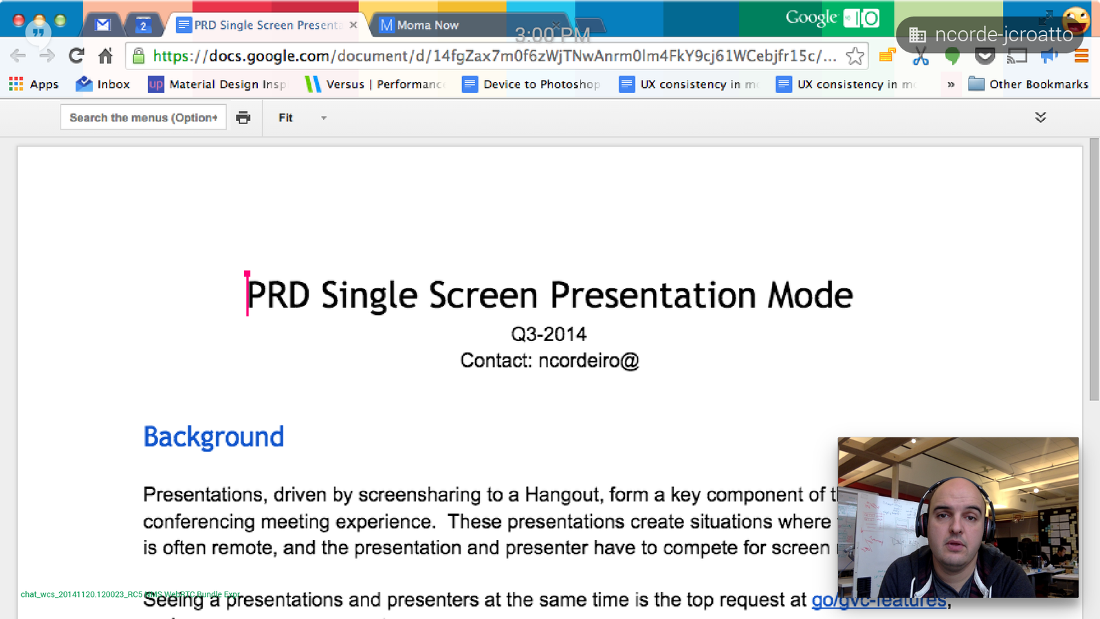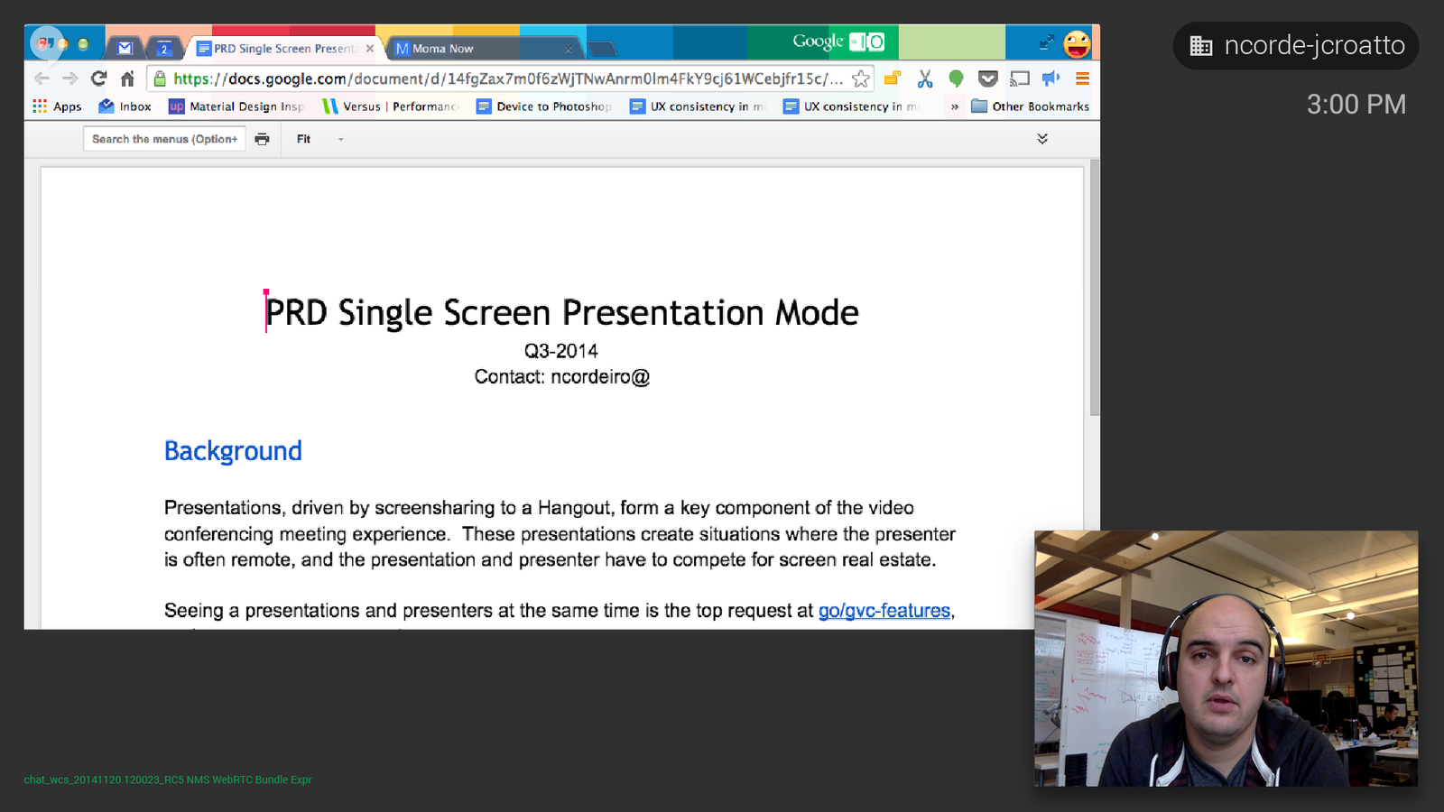 I had been working on the internal video conferencing system for a while off and on. Usually it was light UI fixes, discussions with PM and Eng for updates. During this time GVC was internally new, it was starting to mature separately than other products.